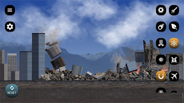 3、接下来我们进入城市粉碎环节,在这个界面中,左下角的按钮可以用来切换背景,右侧则是各种可用的工具。
