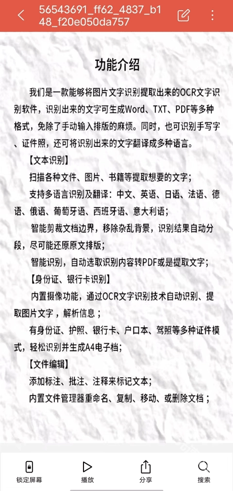 5、保存操作完成后,你会进入“我的文件”页面。在这个页面中,你可以选择打开想要查看的文件。进入文件后,点击右上角的三点图标,会弹出打印、投屏、缩略图、设置以及用其他应用打开等功能选项,你可以根据实际需求使用这些功能。此外,你还能点击“编辑”按钮对文件进行编辑,页面下方还有锁定屏幕、播放、分享和搜索等功能可供使用。