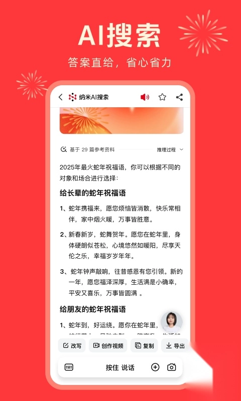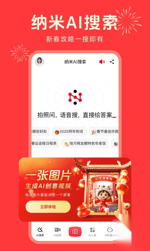 纳米AI搜索为用户提供从简洁到深入的全方位解答方案,助力用户解决识人、识物、解题、旅游攻略等各类问题。