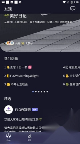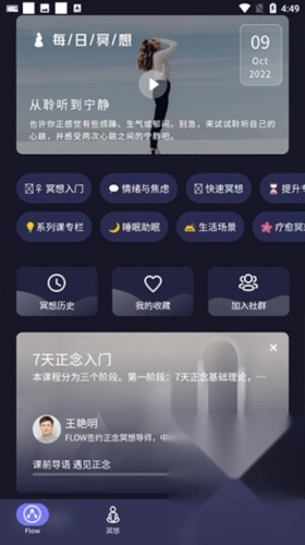 FLOW界面支持每日打卡,涵盖冥想入门、快速冥想、提升专注、关系处理、诗歌冥想等功能模块;页面下滑还能看到各类推荐活动与精选课程。