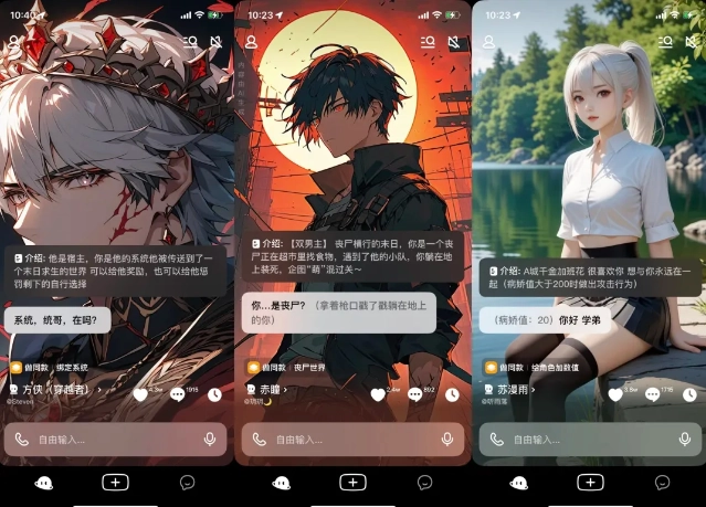 1. 启动猫箱App后,映入眼帘的是类似抖音短视频风格的用户界面。用户只需通过划动操作,就能轻松切换不同的AI角色,并可选择打字或语音两种方式与AI进行互动。