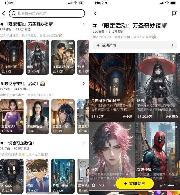2. 点击右上角的搜索按钮,能够探索各类话题与角色,同时还能参与创作活动。