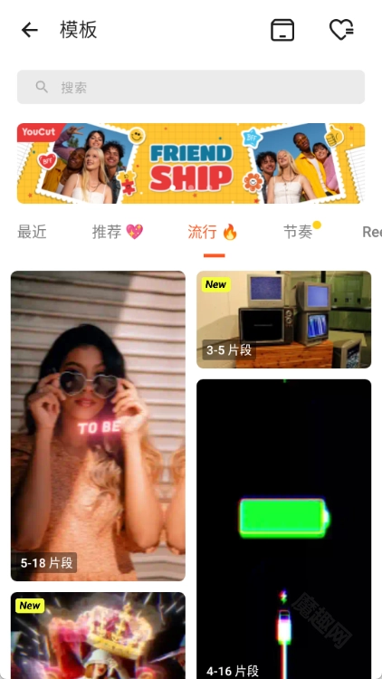3. 点击模板选项,即可浏览推荐、流行、节奏等各类最新热门模板。