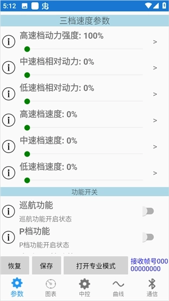 中速档:手机或电脑屏幕上会显示“DM”标识。此时动力系统仅部分启动,相电流的大小会对起步加速性能产生影响,线电流则关系到车辆能达到的最高车速,同时该档位还设有转速限制。通常情况下,中速档的相电流比例设定为最大相电流的75%,线电流比例设定为最大线电流的50%。