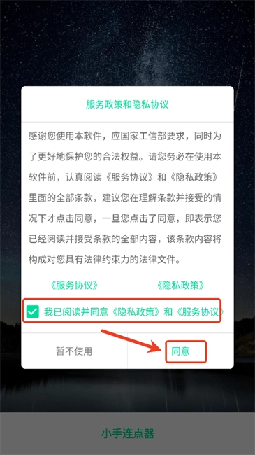 1、首次启动软件时,阅读协议并勾选后点击同意。