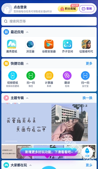 2、支持查看最近安装的应用,另外像视频壁纸、扫一扫、计算器、翻译这些快捷功能也都已完成归类;
