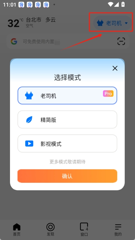 1. 启动哪吒浏览器后,选择你偏好的模式即可;即便选错了也无需担心,直接点击右上角的向下三角形图标就能切换模式。
