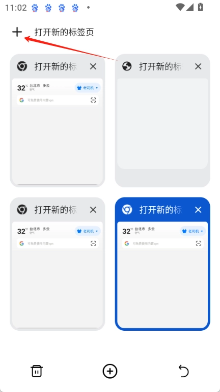2. 点击地址栏左边的“+”号,就能开启新的标签页。