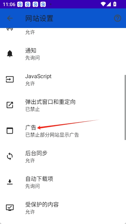 5.哪吒浏览器默认开启了广告拦截功能,能够有效屏蔽网页里的各类广告。要是你想调整广告拦截的相关设置,可以通过“网站设置”进入“广告”选项,然后把对应的开关打开即可。