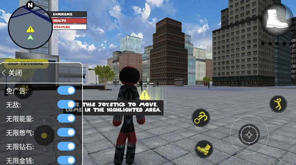 基础操作方面,左侧负责移动与加速,右侧则对应绳索、攻击(兼具跳跃功能)以及跳跃动作;右上侧的武器切换功能,连同血量、经验的实时数据都清晰呈现,各项信息一目了然。玩家可自由选择玩法,与其他帮派成员展开交火——击杀敌人能获取经验,击杀数量累积到一定程度会触发星级机制,届时警察及周边其他角色会对你重点“关照”,发起猛烈攻势。而如何在这样的局势下存活下来,并成功击杀对手,便是你需要完成的核心任务。