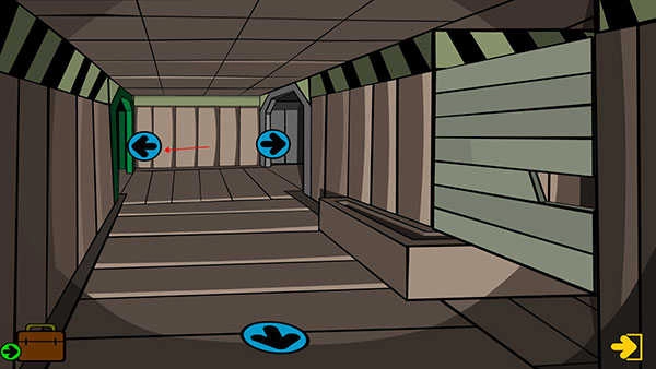 6、点下面箭头,点向左箭头,点右侧墙上灰色隔板,打开隔板,点向上的箭头,进入红色区域,点地上的通风口2次,进入药房。