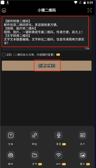 4、邮件、视频、文本、录音、图片、网址、名片等各类内容均可转换成二维码进行分享;