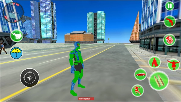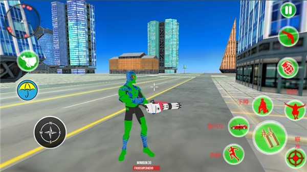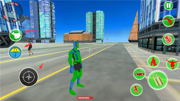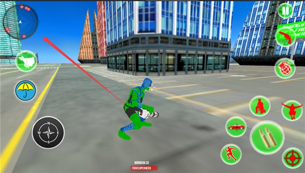在这款以超凡蛛形纲角色为主角的移动游戏界面底部,排列着用于控制角色行动的功能按键,包括让角色快速移动的按键、能吸附车辆的特殊能力按键、使角色降低重心的按键、帮助角色向上腾跃的按键、用于精确观察目标的辅助按键,以及触发攻击的按键。