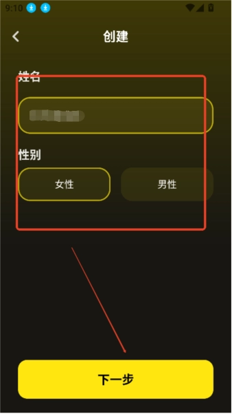 2、在弹出的窗口里填写角色名称,选定性别后点击“下一步”按钮。