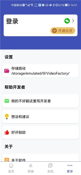 5、点击更多登录选项,设置剪辑视频的储存路径,探索新功能。