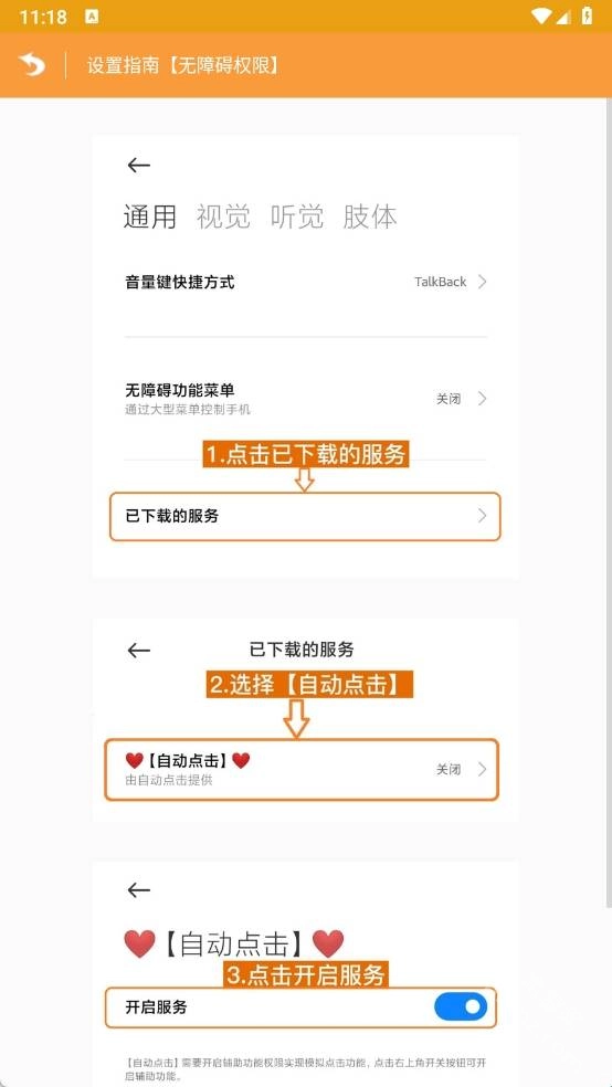 可通过两种方式进行设置:一是在应用内点击“设置无障碍辅助权限”按钮快速完成;二是在手机系统中按路径[设置-更多设置-无障碍-已服务-选择本应用]依次操作。