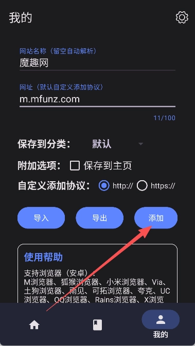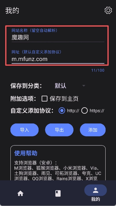 3、输入想要导入的书签网址和相应的网页名称。
