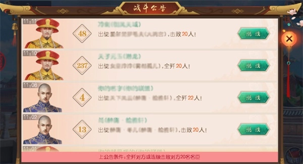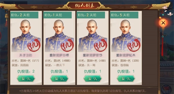 在主界面右下角的【防守记录】里,圣上能查看前来挑战自己的玩家,要是对方击败我方5名及以上大臣,就会直接进入仇人名单。遇到这种情况也不用灰心,只要圣上们用心培养大臣,总有机会派遣自己的大将去复仇,一雪前耻!要留意的是,每位大臣每天只能被指定挑战或复仇一次。