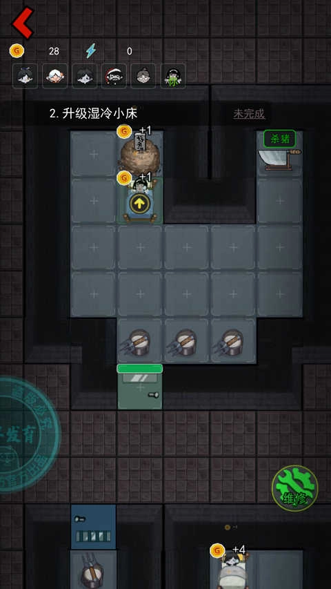 2、升级优先度:找好宿舍后优先提升床的等级和建造两个炮台,因为这个时候猛鬼还没有到来,所以优先提升床铺的等级快速获取金币,然后再去提升门的等级,之后床铺的等级可以暂停一下,优先提升门的等级,否则很容易被猛鬼突破,提升到需要电力的时候再去商店购买游戏机,否则会很容易被猛鬼突破。