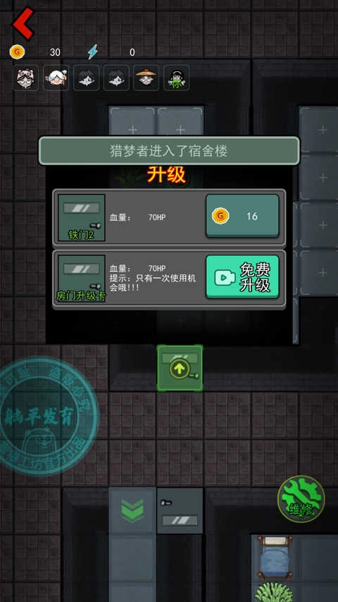 3、门升级技巧:在游戏里面门升级也是有技巧的,因为猛鬼在攻击时候会会降低门的血量,在血量快不足的时候升级门可以将血量瞬间拉满,这样就可以持续抵挡住猛鬼的攻击了,然后继续发展自己的武器。