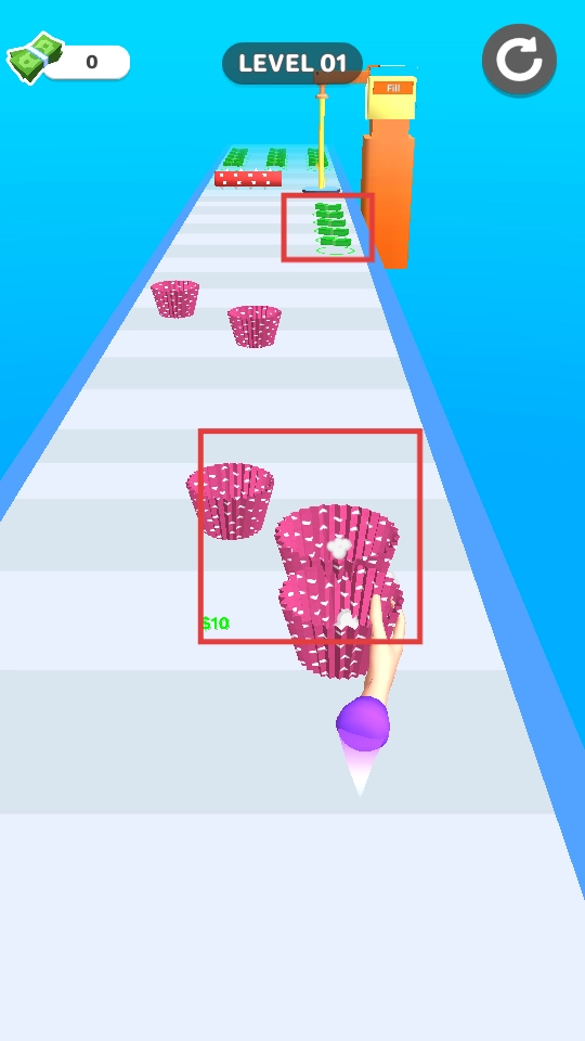 3、避开红色滚筒障碍,将纸杯引导至填充区域,完成蛋糕制作。