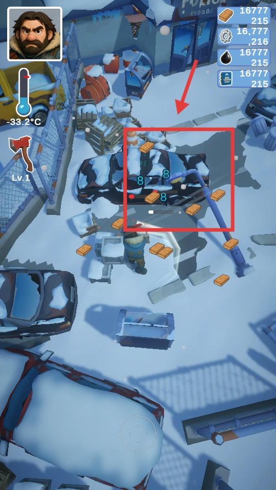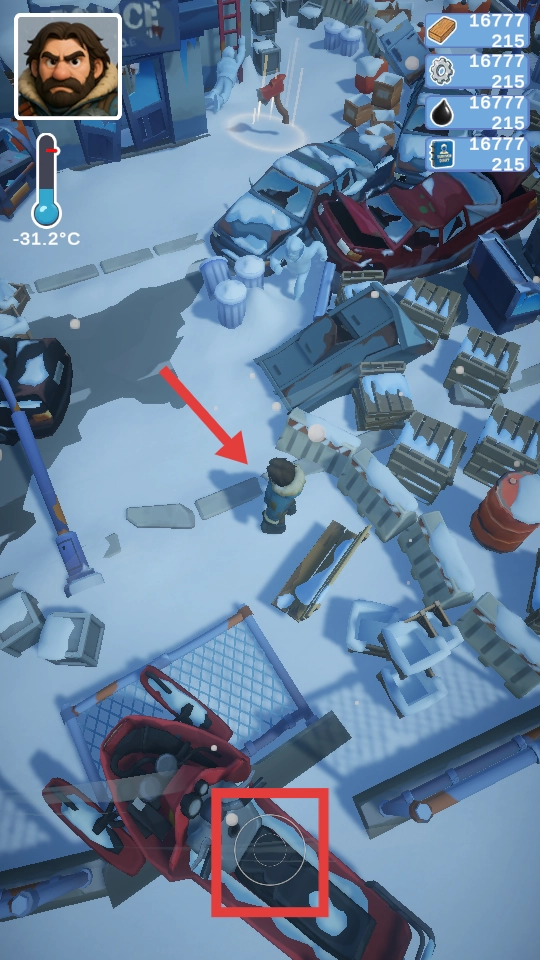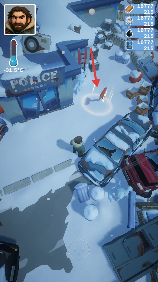 控制角色在雪地场景中移动,探寻周边的车辆、建筑等区域。