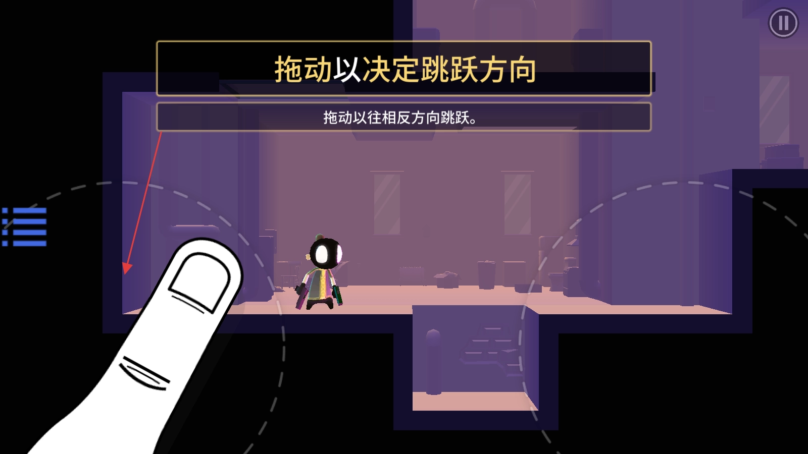 2、拖动屏幕决定跳跃方向,跨越场景中的沟壑障碍。