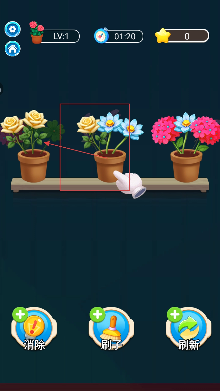 2、观察花盆花卉,将相同的花卉的拖动到同一个花盆,三个相同的花卉在同一个花盆时即可消除。