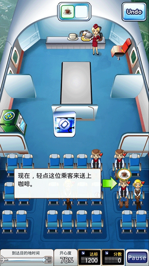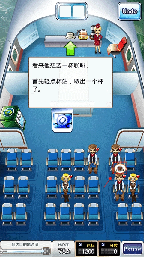 6、现在你的托盘中就有了有一杯咖啡,现在,轻点这位乘客来送上咖啡。