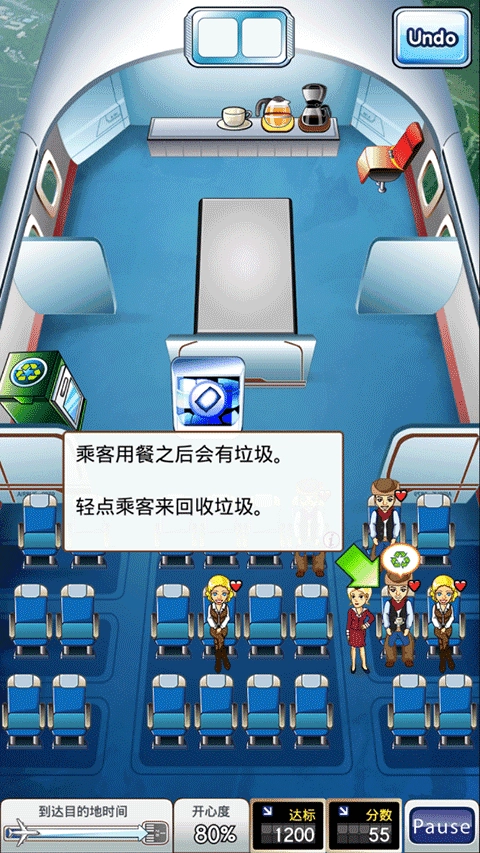 7、乘客用餐之后会有垃圾,轻点乘客来回收垃圾,接着再轻点垃圾桶来倒掉垃圾。