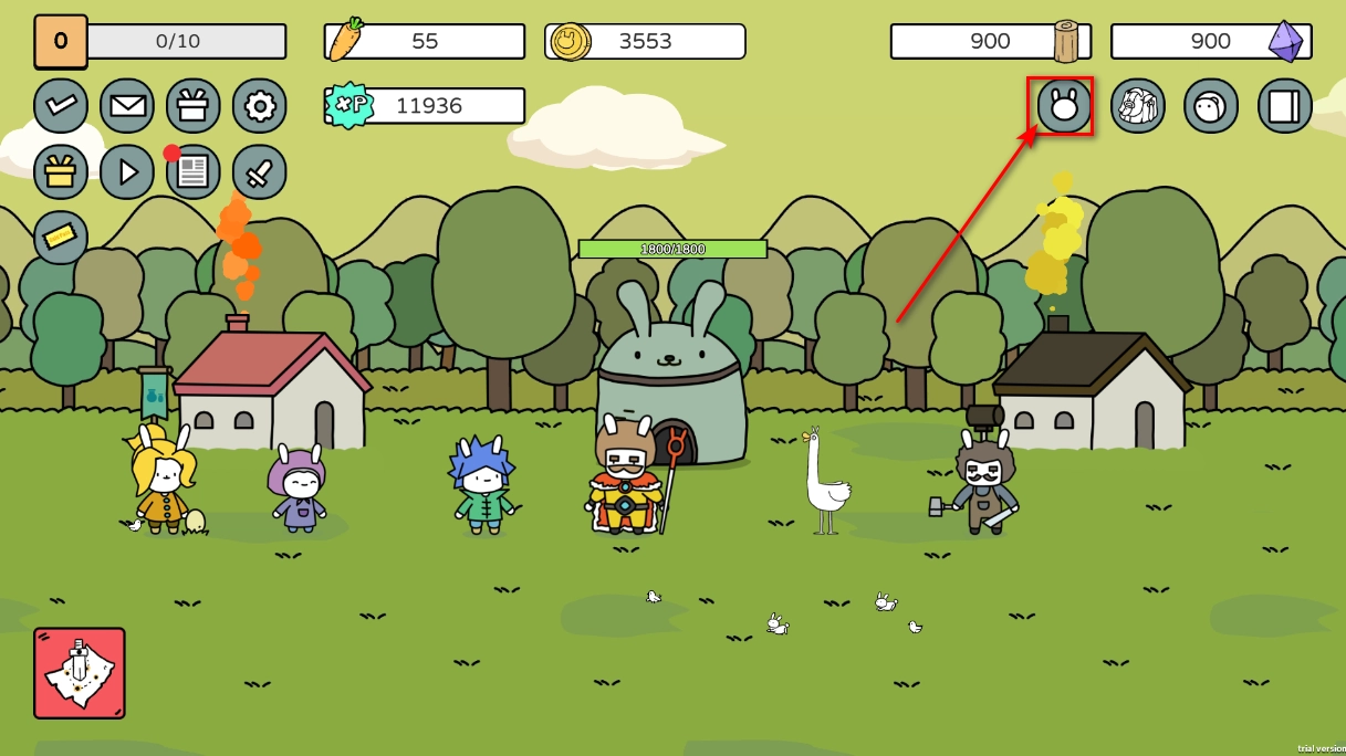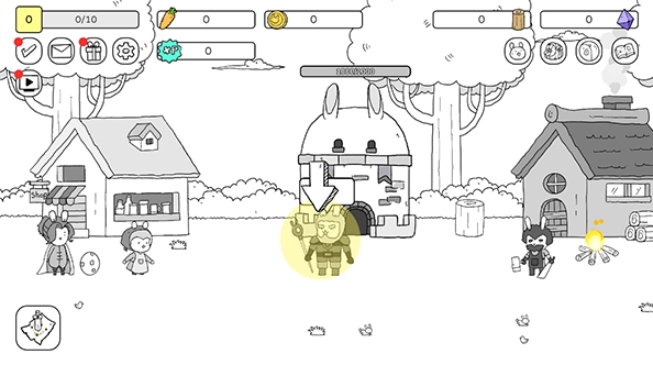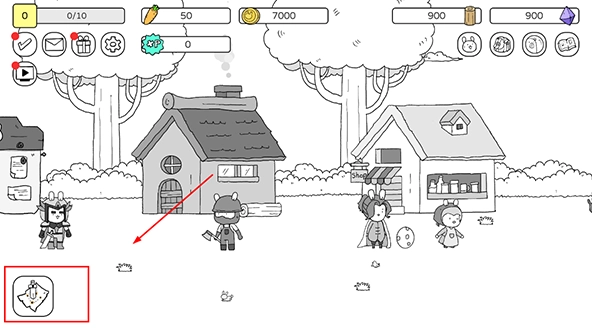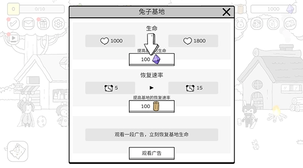 教程结束后,我们先回到最初的兔子以及它左手边的兔子那里,为游戏闯关提前做好战斗准备,升级基地并抽取战斗兔子。