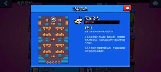 在荒野乱斗里,天选之战是独一份的非平衡玩家对抗模式:玩家会随机分配成天选之子或普通英雄身份。天选之子拥有更强劲的战斗力与超高生命值,要独自应对五位英雄的合围,只要撑过两分钟没被击败就算赢;而另外五个猎手得互相配合,在两分钟内把天选英雄消灭掉才能取得胜利。