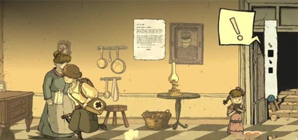 用木料朝身后的狼群砸去,将它们赶跑,救下那个小姑娘。4. 这对母女收留了又冷又饿的Karl,这时突然有人来检查,妇人让Karl赶紧躲到楼上。先别忙着上去,我们能在右侧找到一台留声机。