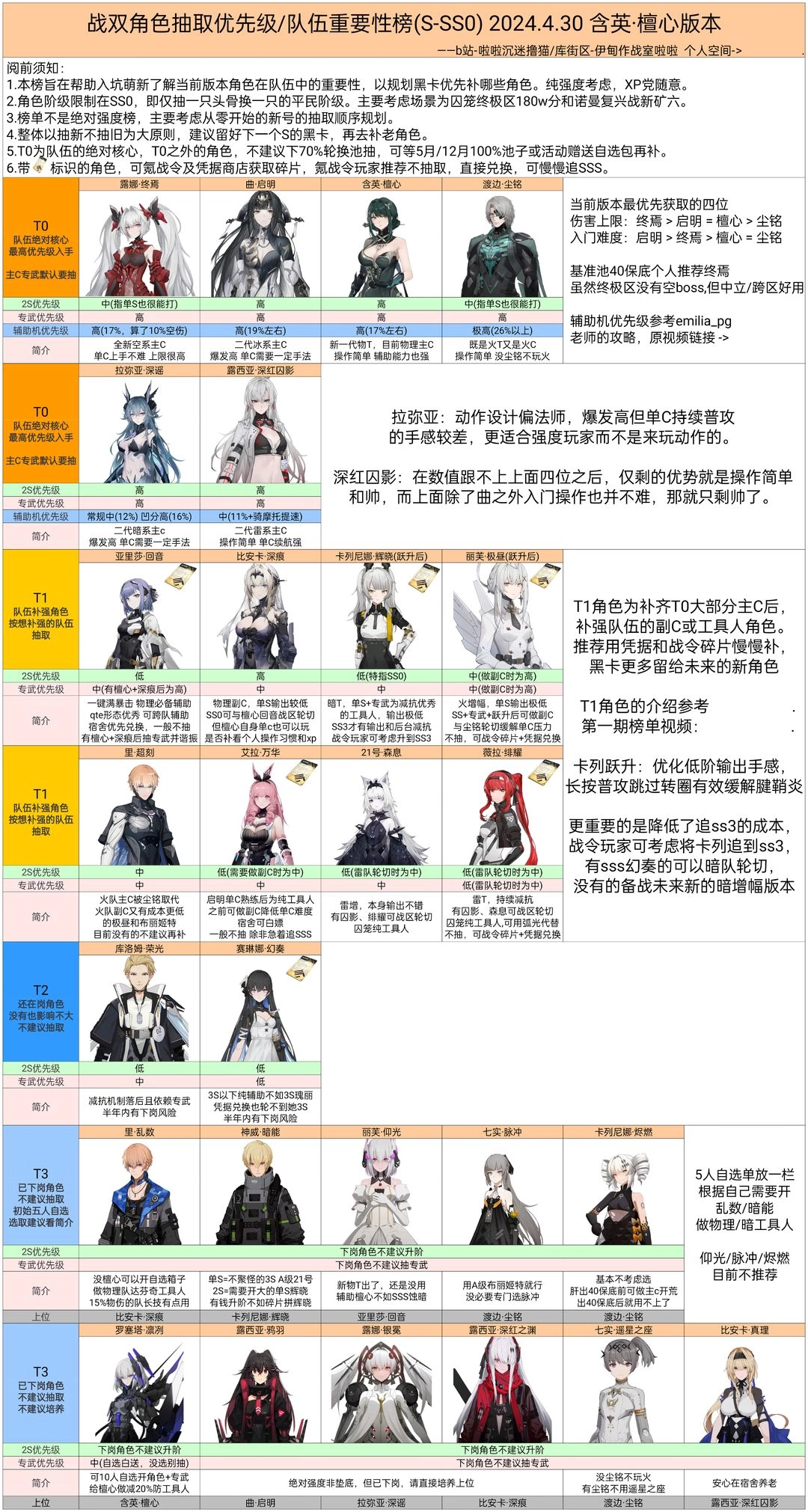 这份榜单主要是为了让刚入坑的萌新能清楚当前版本各个角色在队伍里的重要程度,方便大家规划黑卡优先用来抽取哪些角色。评选仅从强度角度出发,要是你是凭喜好选角色的玩家,可以不用参考这个。
