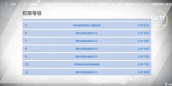 权限等级决定了玩家能挑战角楼临渊的次数,每提升一级,玩家就能获得3%的额外伤害加成;通过消耗体力通关章节关卡,可以积累权限经验。当权限等级达到某些特定阶段时,还会解锁特殊效果:比如等级到5级,所有成员能永久拥有霸体状态;等级到10级,则能永久获得无限能量,对玩家来说相当省心省力。