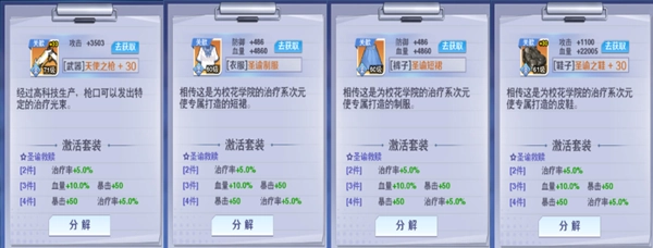 整个装备体系围绕套装属性构建,游戏中的套装包含轻装上阵、作战精英、超能战姬、暗夜魅影、圣谕救赎这几个系列。值得注意的是,套装属性是固定不变的,和装备品质没有关联,因此想要获得强力的套装属性其实并不困难。