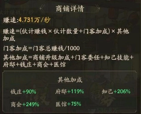 商铺加成的类型由门客的职业决定,而加成数值则取决于门客的派遣技能。