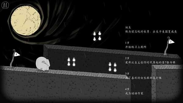 采用黑白两色作为核心视觉基底,巧妙呼应了游戏的主题命名。游戏流程仿照人生模拟的体验模式,通过数字进度与文字叙事的结合,呈现玩家在成长历程中遇到的各种境遇。一旦在挑战里失足掉落,这段成长故事便会戛然而止。此外,游戏还设有完善的图鉴收集系统,通关时的行进距离决定了最终奖励的丰厚程度,借助类似技能树的操作界面,玩家可收集特定标识,感受独特的成长式历练过程。