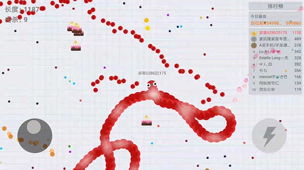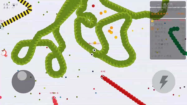进入游戏后,屏幕左侧是方向控制区,用于调整小蛇的移动路线;右侧是加速按键。点击该按键可开启冲刺模式,但要留意每次使用都会消耗小蛇的部分身体长度,所以使用时需谨慎考虑。