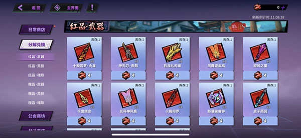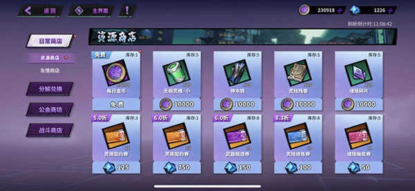 黑市包含日常商店、分解兑换、公会商店与战斗商店这四个主要板块。友情点能够用来兑换抽卡券之类的资源;分解高品质的武器和灵技可以获取相应的货币,这些货币可用于兑换更高级的装备与技能,尤其是红色精粹,对后期的强化起着关键作用。