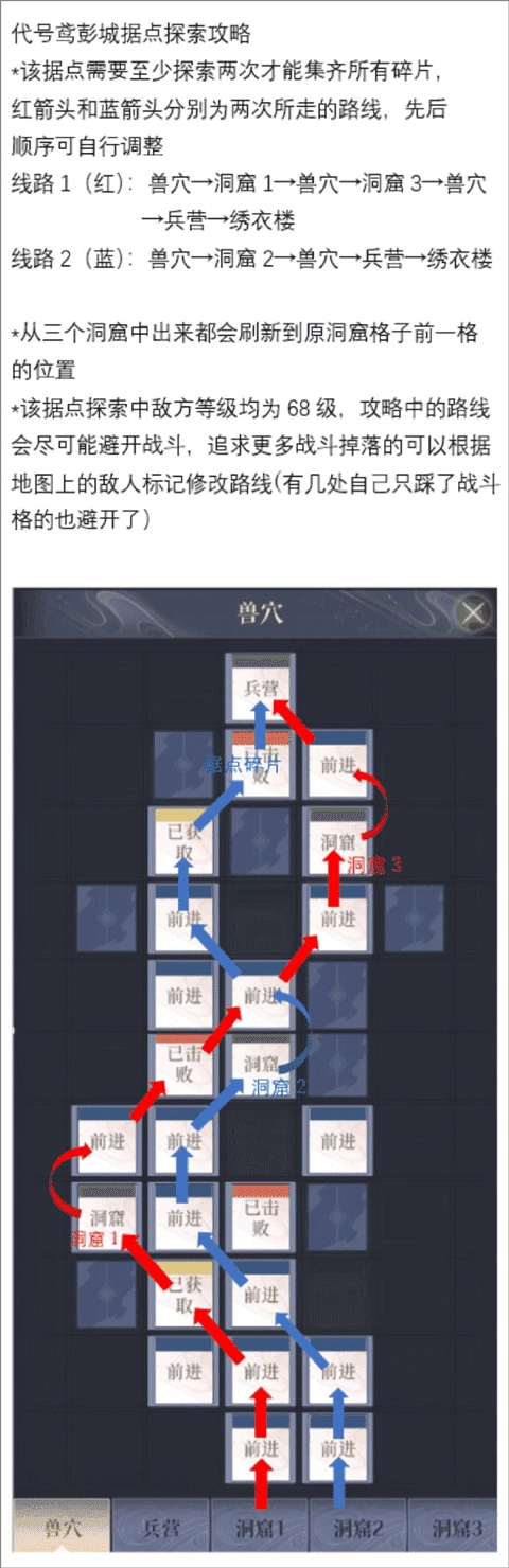 线路2(蓝):兽穴→洞窟2→兽穴→兵营→绣衣楼