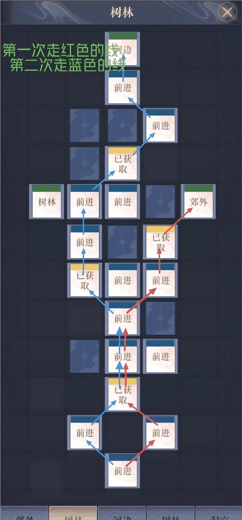 树林1(p2)要先沿着红色路线返回郊外,接着从郊外前往树林1,之后走蓝色路线。