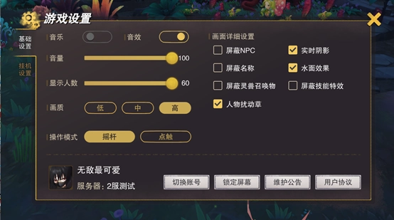 首先,游戏设置界面的操作模式提供摇杆和触屏两种选择,玩家可依据自身习惯来挑选。选好操作方式后,在其下方能找到画质调节板块。要是想领略塞尔大陆的绝美风光,推荐把画质调至最高档;右侧的画面详细设置里,你可以自行关闭部分视觉效果,也能调整场景细节度、人物阴影等具体参数。另外,设置页面底部配备了账号切换功能,不用退出游戏就能切换其他角色,十分便捷。