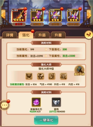 强化界面里有个“强化大师”功能,当装备累计强化到10级的时候,强化大师等级就会跟着提升,升级之后可以激活额外的属性加成,让角色战斗力得到大幅增强。