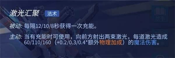 大招“激光汇聚”会朝正前方射出两道激光束,每一道都能带来高额伤害,最远射程为12米,拥有极强的远程压制能力。需要留意的是,要依靠被动技能和三技能持续积累充能层数,才能确保爆发时的强度。