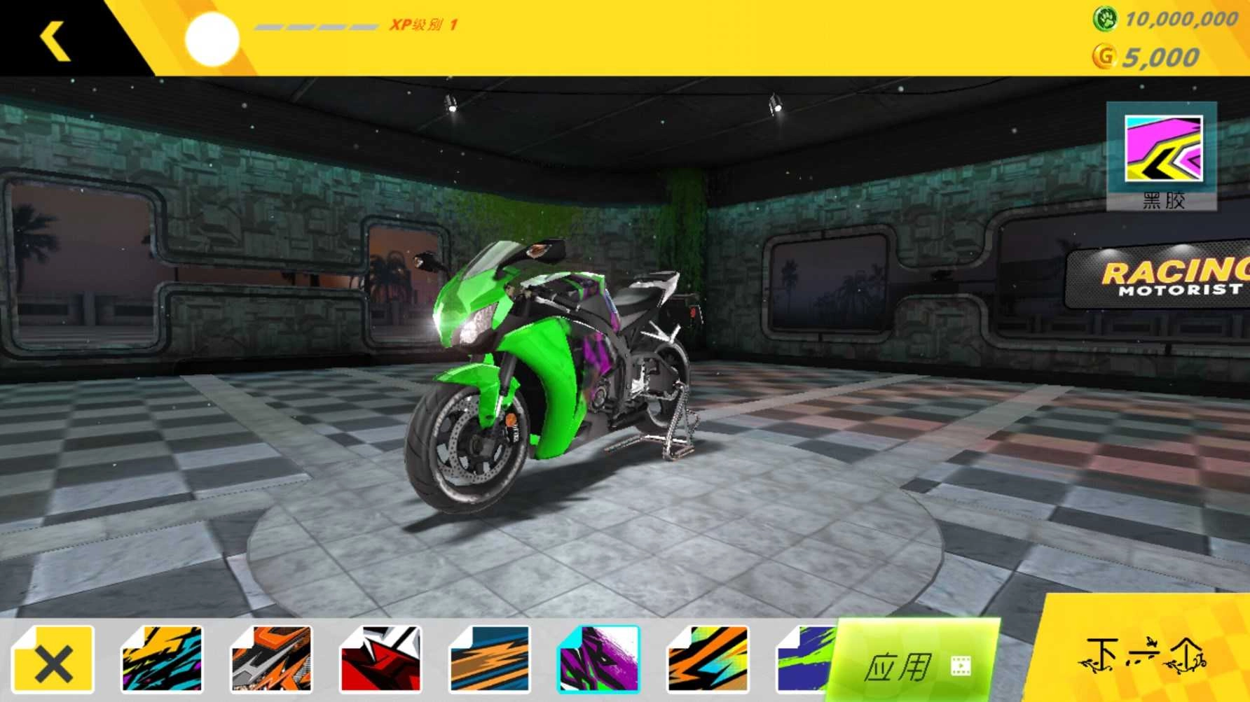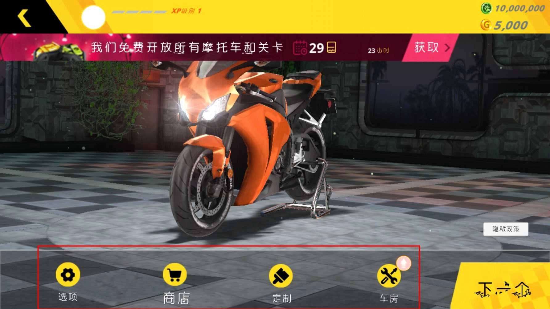 3、游戏中提供“选项”、“商店”、“定制”、“车房”等功能模块,方便你管理摩托车及个人资料。