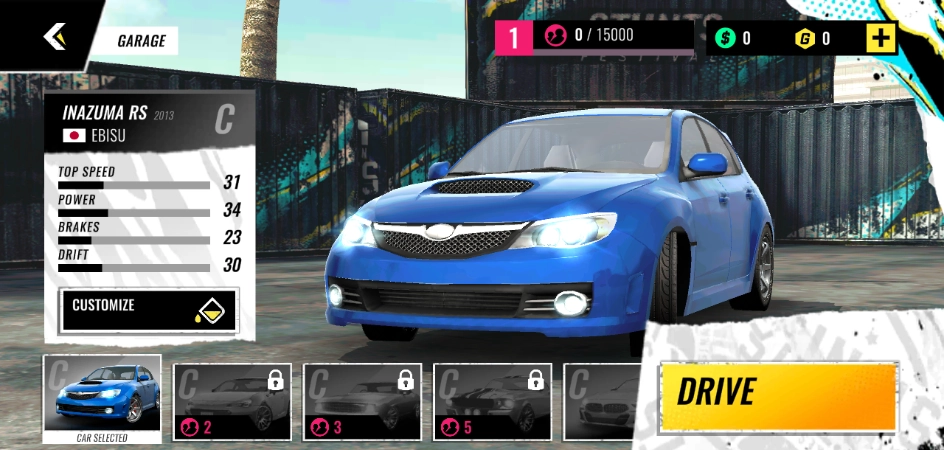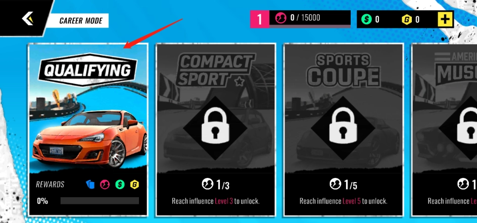 2、接下来,在游戏开始前,你可以先去车库挑选自己喜欢的赛车。赛车有C、B、A、S四个等级,不过一开始资金不多,现在只有一辆车能选。点一下右下角的黄色按钮回到主页面,再选择你想玩的模式,这里我们就拿职业模式来举例说明。
