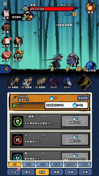 2、通过提升刀法等级强化攻击力,感受重生轮回带来的全新趣味,挂机玩法与闯关模式相互融合,带来双重休闲解压的体验。