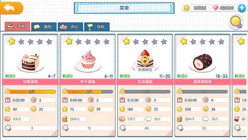 在操作台上进行甜品的制作与研发,甜品共划分为四大类别、四十个品种,后续可通过升级或完成任务解锁更多品类。料理的星级评定最高为五星,提升星级后其属性会更加出色;无论是制作甜品还是研发新品,都需要消耗相应的食材和体力。