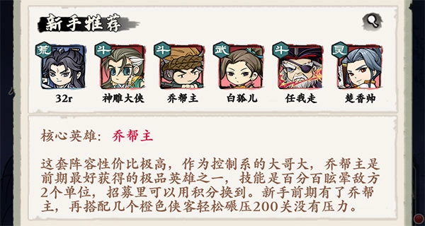 核心英雄选择乔帮主。这套阵容的性价比非常高,乔帮主作为控制系的顶尖存在,是前期最容易获取的极品英雄之一,他的技能能够百分百眩晕敌方两个单位,而且可以通过招募系统用积分兑换到。新手玩家在前期如果拥有了乔帮主,再搭配上几个橙色侠客,轻松通过200关是完全没有问题的。